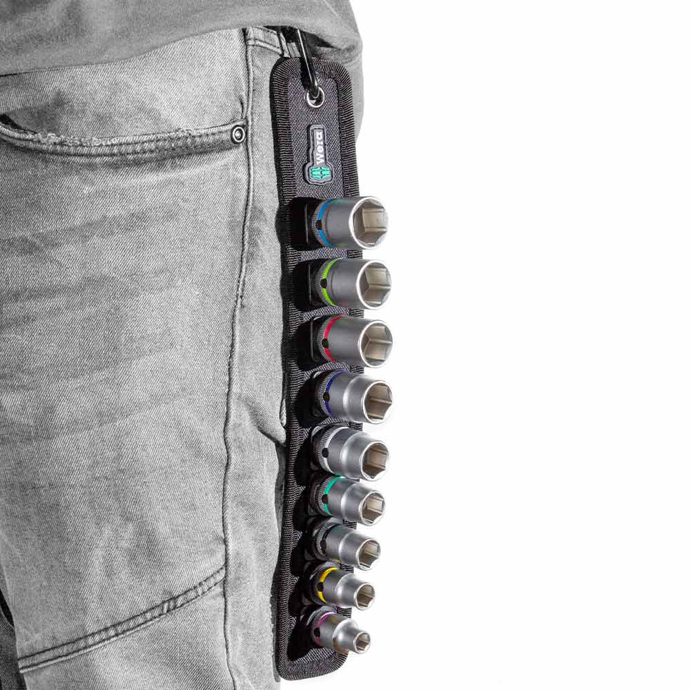 Robuuste stoffen riem (belt) in kenmerkend Wera design voor 9 doppen plus verwijdertool op beperkte ruimte. Een soepel draaimechanisme zorgt voor een veilige grip en maakt eenvoudig verwijderen van de doppen mogelijk.